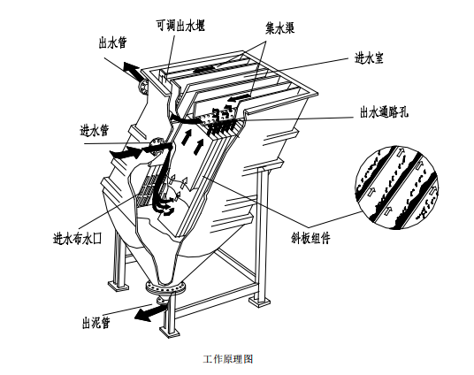 废水由进水管进入池体,向下流通过位于池体中间的进水室,由导流板反射,再通过 里面的进水布水口进入斜板。 随着溶液向上流动,其所含的固体颗粒就沉淀在平行的斜板组件上,然后滑入池体底 部的污泥斗,在污泥斗中,污泥浓缩后通过污泥出口排出。而其澄清液离开斜板通过顶部 的出水通路孔流出,然后通过可调出水堰流汇集,由出水管流出。 在斜板顶部设计通路孔的目的是使澄清液在通过集水渠时形成一个压力差,保证各斜 板间流态分布均匀,从而使整个面积都被利用。这样操作的可靠性增大,减少溶液流态影 响,还减少了结垢淤积的可能。