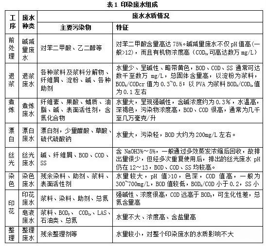印染行业是纺织工业用水量较大的行业,水作为媒介参与整个染整加工过程。印染废水水量大,色度高,成分复杂,废水中含有染料、浆料、助剂、油剂、酸碱,纤维杂质及无机盐等,染料结构中硝基和胺基化合物及铜、铬、锌、砷等重金属元素具有较大的生物毒性,严重污染环境。印染废水中的污染物主要来自织物纤维本身和加工过程使用的染化料,在印染生产的前处理过程中排出退浆废水、煮炼废水、漂白废水和丝光废水,染色印花过程排出染色废水、皂洗废水和印花废水,整理过程排出整理废水。